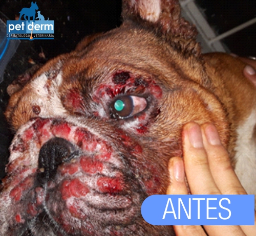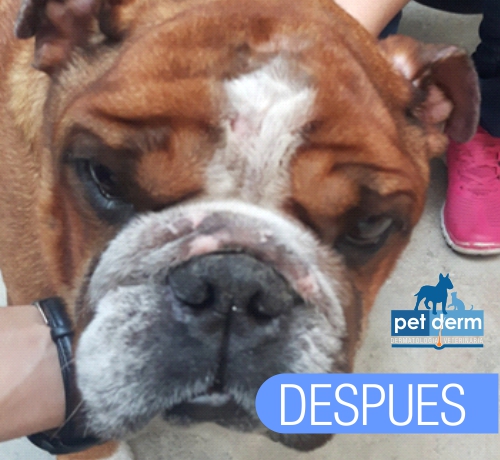 ![]() ![]() Paciente felino, que llega con problema de piel en la parte frontal, y 6 semanas después de tratamiento con especialistas. ![]() ![]() Paciente post diagnostico y tratamiento. | ![]() ![]() Paciente Bulldog 6 semanas post diagnostico y en tratamiento.